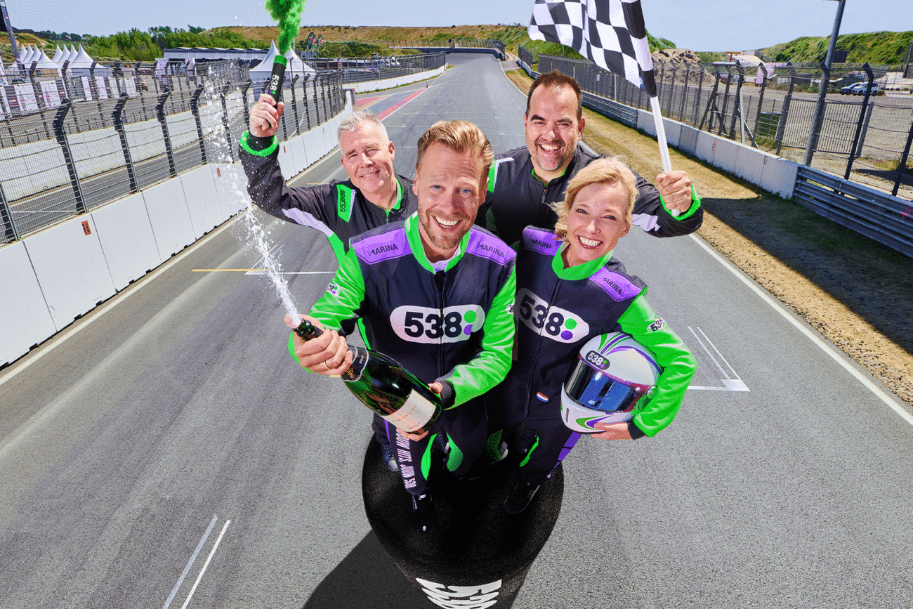 For the photography we moved our team towards the finish line. Donned in Radio 538 branded racing suits the DJ’s poses on a life size 538-microphone. Cheering us on with iconic F1 inspired props. The photography was used in a wide variety of deliverables, including digital out of home, display-ads and paid socials.